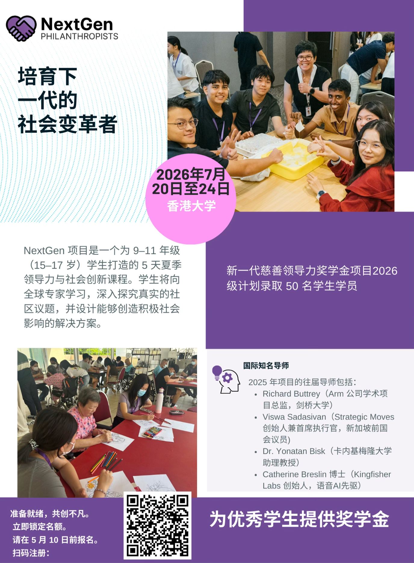 「新一代慈善领导力项目」将于2026年首次走进香港,标志着该项目自新加坡成功启航后,首次在海外落地。首届香港项目由香港大学承办,面向15–17岁的青少年学生,围绕主题 「艺术 × AI 公益创新」,引导学员探索艺术创意、科技与社会责任如何交汇融合。